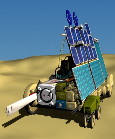 L'économie de Gani est agricole et primitive, et offre peu de possibilités d'exportations vers Métropolis, distante de 4000 kilomètres. Les Shaïm Nabar doivent donc recourir à d'autres sources de revenus pour s'acheter l'eau essentielle à leur survie. La guerre a parsemé le désert d'épaves spatiales, de camps abandonnés et de gigantesques champs de bataille. Le matériel qui s'y trouve possède toujours une certaine valeur marchande, même la guerre achevée, mais compte-tenu des conditions extrêmes qui règnent dans le désert, seuls les Shaïm Nabar sont prêts à en faire la collecte. Pour mener ces opérations de ferraillage et de collecte, les Shaïm Nabar ont construit à partir de pièces disparates des véhicules propulsés à l'éléctrécité photovoltaïque, les caraques. Ces véhicules sont lourdement chargées de matériel (généralement 20 tonnes par caraque), et compte-tenu du faible rendement des plaques photovoltaïques en comparaison avec cette charge, les caraques voyagent à une vitesse de 4 km/h, soit au pas. Ceci permet aux caravanistes Shaïm Nabar de marcher dans l'ombre de ces engins. Les caraques ne sont donc pas concues pour transporter les caravanistes, qui peuvent ainsi les charger à bloc. Parfois, une caraque peu chargée peut tracter un camion, un tout-terrain voire un blindé vers le Comptoir des Shaïm Nabar à Métropolis. Les caraques sont dotées de batteries, qui fournissent un supplément d'énérgie lors des montées et sur terrain difficile . Les batteries se rechargent dans les descentes via les moteurs éléctriques ce qui permet de garder la vitesse constante - les Shaïm Nabar n'aiment pas courir à 50°C à l'ombre. |