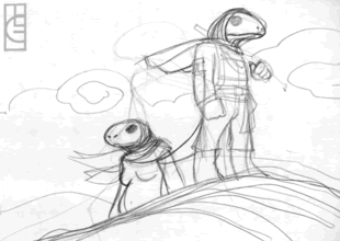Illustration réalisée par Le Grümph Je me demandais toutefois si j'allais survivre assez longemps pour pouvoir moi aussi connaître une femme. Lors du long chemin vers le centre de collecte, je me mis en tête que rien de merveilleux ne m'attendais à destination, mais que je reverrais peut-être les astronefs de Métropolis, dans deux ans, avant de mourir. Je pris un enfant sous ma protection, comme j'avais été moi-même adopté. Le voyage jusqu'au centre de collecte se passa bien, nous ne perdîmes qu'un seul homme, et cela en raison de sa seule négligence. Le centre de collecte était au milieu d'un champ de bataille de la guerre qu'avaient livrés les humains entre eux, et pour lesquels ils nous avaient conçus. Il ne restait plus grand-chose de valeur à prendre, la caravane suivante évacuerait certainement ce centre. Sur le chemin de Métropolis, nous tombâmes dans une tempête de sable, qui nous retarda deux semaines. Enfermés sous la bâche de nos caraques, le temps nous sembla long. Deux semaines de vie perdues pour rien ! Pour m'occuper, j'examinais le prospectus qu'on m'avait donné il y a deux ans. New Neural Fruits. Quelle musique jouaient-ils ? Me plairait-elle ? Existaient-ils encore ? Je devins hanté à l'idée de ne jamais pouvoir les entendre, le seul groupe de musique dont je connaissais l'existence. Cette pensée m'obséda, alors que nous reprîmes la route. Métropolis était à une année de nous. Nous perdîmes notre vétéran, qui mourut une nuit de sa mort naturelle. Comme Morkat l'avait fait avec moi, je confiais les morceaux sacrés au plus jeune de nos espoirs. Notre voyage vers Métropolis fut rude. Notre Erudit fut tué par un des hommes de sa caraque, que nous tuâmes aussitôt après son crime. La direction de la caravane me revint ; j'étais obsédé par la crainte de perdre la piste. Un sextant et une boussole, c'était tout ce que j'avais avec moi. Lorsque qu'après cinq mois nous trouvâmes la carcasse désossée d'une caraque qui avait sauté sur une mine en son temps, j'étais autant soulagé que les autres étaient effrayés. Je n'avais donc pas perdu mon chemin ! Fort de cette réussite, je regagnais confiance en moi, et put mener la caravane à son but. J'avais dépassé ma quatrième année, et j'avais fait le tour de la question du sens de la vie lors d'innombrables heures passées à marcher et de nuits passées à parler. Métropolis vint à moi comme l'accomplissement d'une vie bien menée. La femme de Knop n'était plus, elle avait également bien vécu sa vie. L'enfant de Knop était une fille, qui s'était montrée une guerrière fort capable depuis le temps. Je pus la connaître, et connaître moi aussi la félicité d'avoir procrée, bien que je vivrais certainement pas la naissance de mon enfant. Ma femme m'emmena dans un magasin de musique, où je puis poser la dernière question qui restait ouverte dans ma vie. Oui, les New Neural Fruits jouaient encore, ils avaient eu un grand succès il y a un an, l'époque où, dans la tempête de sable, j'avais relu leur prospectus ! Le vendeur, bien que surpris de voir le premier Shaïm Nabar de sa vie, me passa l'intégralité des oeuvres des New Neural Fruits. Ce fut la seule fois où je pleurais, de toute ma vie. Je n'avais jamais connu d'autre musique que nos chants de marche. Si je pouvais vivre une autre vie, je la vivrais en musique. Une semaine plus tard, je fis mes adieux à ma femme, et à Métropolis. Malgré mon grand âge, je tenais bien la route. Je racontais aux jeunes comment devenir un bon guide, et comment appréhender les merveilles empoisonnées de Métropolis. Mes forces tinrent jusqu'à Gani, et je mis un point d'honneur à ne pas freiner la caravane d'une minute. Une fois la caravane arrivée à bon port, il me semblait que le temps récupérait les forces qu'il m'avait confié dans ce dernier voyage. En quelques jours, je ne pouvais plus marcher. Mais je n'avais pas tout bu de la coupe de la vie. On me mit sur une civière, pour m'emmener loin dans Gani, dans le quartier des Erudits, dont l'air est lourd et vicié. Là, une femme plutôt vieille me connut, sans amour et avec empressement. Elle avait certainement peur que je ne meure avant la fin ! Je n'ai pas aimé cette dernière chose, ni pendant ni après. Lorsque le temps d'un homme est venu, il faut le laisser faire son oeuvre. Ce dernier enfant n'a pas été voulu. Mais je suis bien trop proche de la fin pour pouvoir y changer quoi que ce soit. Maintenant que mes forces me quittent, je dois dire que je suis content de la vie que j'ai vécu, à l'air libre, avec ses responsabilités, ses surprises et ses récompenses. Je n'aurais pas eu tout cela, enfermé dans cette grotte suintante, je n'aurais pas connu ce soleil qui éclaire chaque être vivant de l'univers. Mais peut-être aurais-je connu ma mère, le seul véritable regret de ma vie. On va maintenant me porter à un promontoire de roche, qui surplombe tout le Yoni-Ga. Là, après avoir vu le soleil se lever une fois de plus, je me jetterais pour aller la retrouver. |