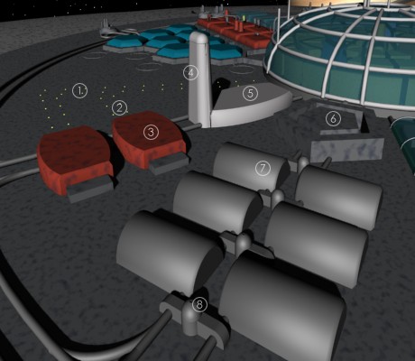1. Piste de décollage / aterrissage 2. Piste menant au hangar 1 3. Hangar 1 (maintenance, réparations, cale sèche, chantier naval) 4. Tour de contrôle, Hotel Magna Stella, administration de l'astroport 5. Astroport 6. Centre de commandement militaire 7. Caserne 8. Fortin intermédiaire pour défense du complexe au sol |