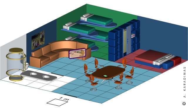 Un écran à plasma joue le rôle de télévision et de console d'accès au Réseau. On peut accéder au réseau au moyen d'un clavier, mais on prefère généralement utiliser le robot virtuel du conapt. Celui-ci apparaît sur l'écran et est capable d'interagir avec l'utilisateur, qui se contente alors de dicter son ordre. Le robot virtuel peut être un moteur de recherche sur le Réseau, mais peut également exécuter des tâches plus complexes, comme tenir les comptes ou aider à faire les devoirs des enfants. Le robot virtuel obéit différemment selon la position des interlocuteurs par rapport aux habitants de la maison et du chef du foyer. Chaque conapt est doté d'un œil électronique permettant d'observer qui est à sa porte et de le faire faire lors de son absence par le concierge, par le robot virtuel ou enfin par distance au moyen du réseau. |
