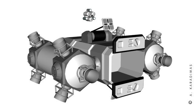 Ce robot peut effectuer une sortie et s'amarrer au vaisseau, au moyen de ses éléctro-aimants dirigeables, en moins d'une minute. Des petits robots d'observations et d'éclairage flottent autour de lui pour éclairer la zone de travail et fournir des informations (vue optique, infrarouge, therlmique, radiations etc.) aux modules de travail de la soute. Le robot M12 est très versatile. en dehors de ses fonctions de maintenance, il sert couramment de canot de sauvetage, de navette entre vaisseaux, de remorqueur de containers. Pendant la guerre, il a également servi de chaloupe d'abordage, de porte- et lance-torpilles. |